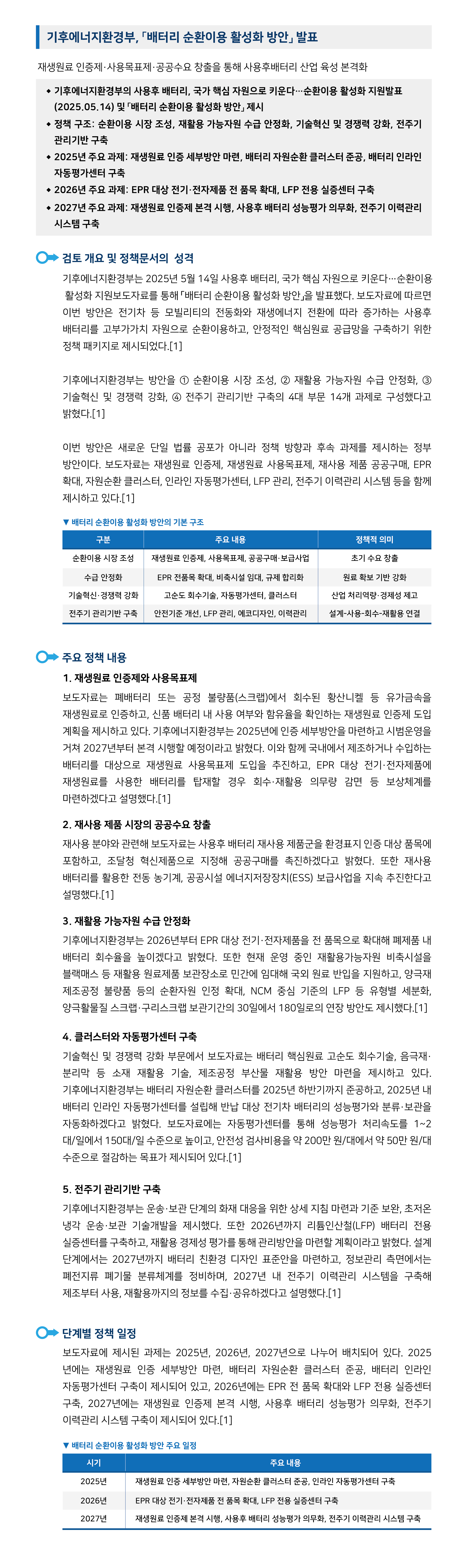[1] 기후에너지환경부, 「사용후 배터리, 국가 핵심 자원으로 키운다…순환이용 활성화 지원」, 보도·설명