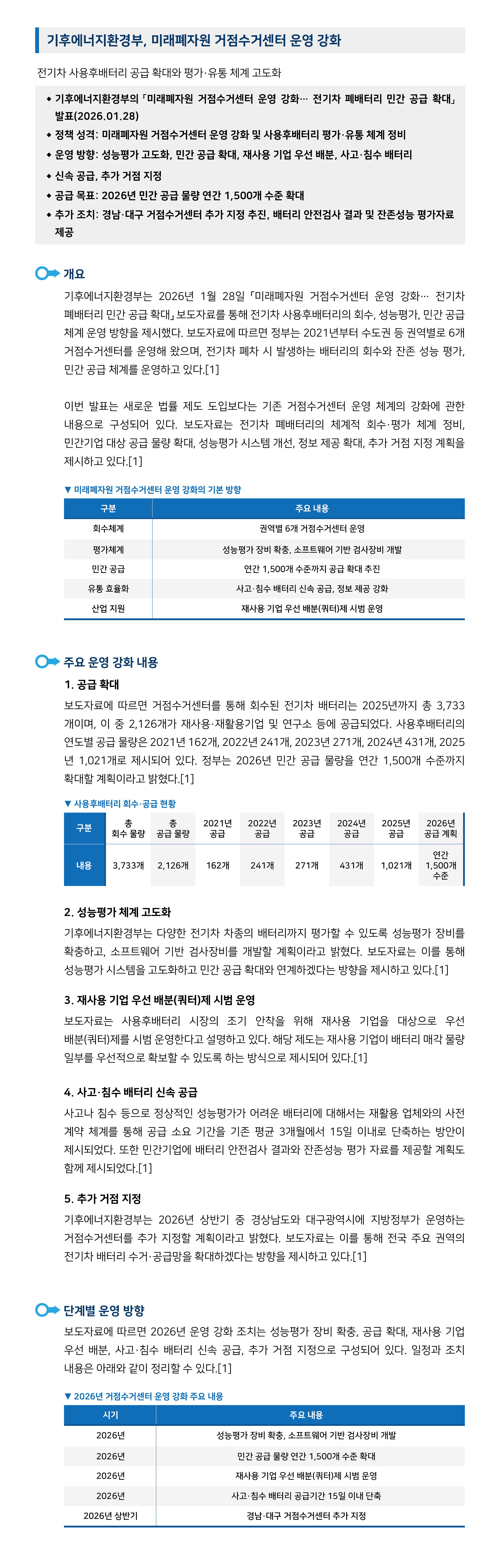 [1] 기후에너지환경부, 「미래폐자원 거점수거센터 운영 강화… 전기차 폐배터리 민간 공급 확대」